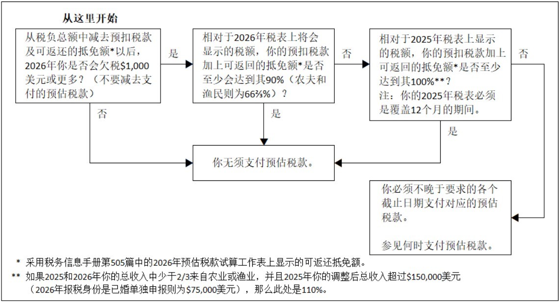 - 你在2025年税表上的应付税款余额不超过2025年税款总额的10%,并且要求的预估税款都是按时支付;